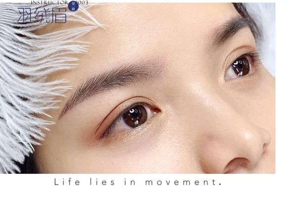 使用博尔美泽 P1+ 0.25单针,开机调出针长度1.5mm,吸取少量色料,针尖和皮肤呈90°垂直,抛针轻重轻入皮,先做主线条,搭建眉毛骨架,然后在眉头以及线条空隙大的地方填充绒毛。最后在线条之间空隙的地方进行轻薄地打雾。颜色可以选用同一种。单针打雾的方向,就按照线条的走向,一遍一遍的划打出雾状。