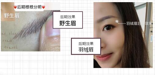 野生眉的后期效果呈现出线条依然非常立体,根根分明。而免麻羽绒眉的后期呈现出雾朦胧的线条感,如同羽毛般。两种纹眉各有各的优点,能塑造出的风格也非常多,是目前市场最受欢迎的两种高端纹眉方式。