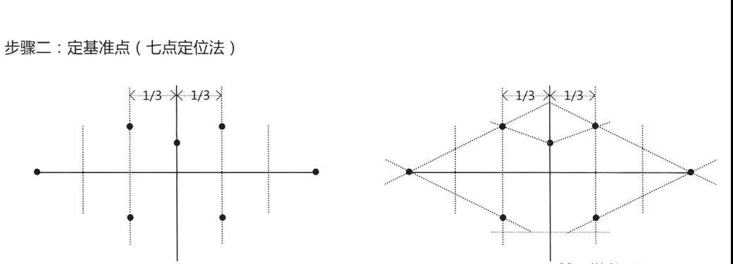 上下唇以“十”字来区分,中线上延长线为唇峰。左右各分一半,在一半当中又分三等份(如上图)。