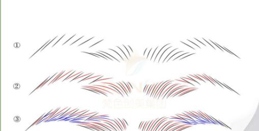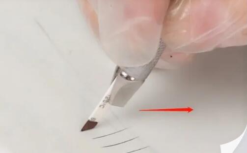 推(右边眉形):针尖朝向自己,往外去推,针片垂直,以摆-划-提为主,轻放,慢慢的拉然后抬起